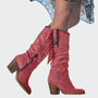 Stivali da donna in stile boho-western con ispirazione cowboy, realizzati in materiale scamosciato con dettagli particolari. Presentano frange laterali e decorazioni con pietre turchesi e elementi metallici che conferiscono un carattere unico. Il tacco medio garantisce comfort ed eleganza, perfetto per look che uniscono libertà e stile.