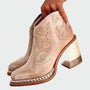 Stivaletti da donna moderni in stile western, con particolari ricami e dettagli decorativi sulla suola. Il tacco effetto legno con inserto trasparente dona un tocco unico di carattere ed eleganza, mentre la calzata confortevole li rende ideali per look alla moda dalla mattina alla sera. Un capo statement che unisce comodità e uno stile deciso.