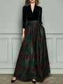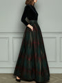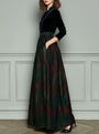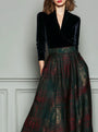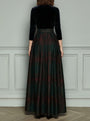 Scopri un’eleganza senza tempo con questo abito da sera a vita alta in velluto e tessuto scozzese. La ricca texture del velluto si combina con un classico motivo a quadri per un look sofisticato e originale. La vita alta valorizza la figura, mentre la gonna lunga cade con grazia, rendendolo perfetto per eventi formali e serate speciali.