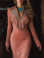 Questo abito maxi Western vintage unisce romanticismo delicato e fascino rétro, realizzato in morbido finto camoscio rosa e arricchito da ricami dettagliati e frange ondeggianti. La tonalità rosa aggiunge un tocco vivace allo stile Western classico, mentre la texture vellutata del finto camoscio e la lunghezza maxi donano eleganza, perfetto per festival, cene all’aperto o qualsiasi occasione che richieda un’atmosfera nostalgica.