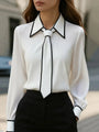 Crea un look sofisticato ed elegante con questa camicia tie-dye dalle finiture a contrasto, che aggiunge un tocco moderno e di stile al tuo guardaroba da lavoro. Realizzata in morbido tessuto avorio, la camicia presenta profili neri esagerati su colletto, polsini e cravatta integrata, creando un effetto grafico di grande impatto visivo.