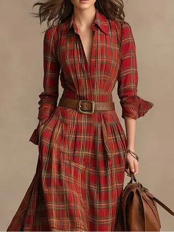 Questo abito a camicia a quadri con colletto, maniche lunghe e bottoni emana eleganza.