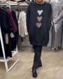 Una miscela audace di comfort e fascino, questo abito maglione oversize unisce morbidezza e brillantezza. Caratterizzato da tre grafiche a cuore accattivanti, aggiunge una personalità giocosa al tuo guardaroba quotidiano. Perfetto per sovrapporre o rilassarsi, ti avvolge con stile senza compromettere il calore.